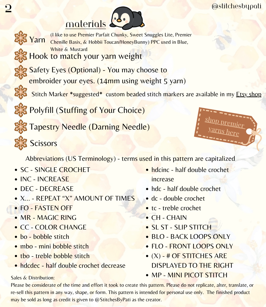 This pattern includes instructions to make Pudding the Penguin along with baby fish and bow patterns. This is an advanced beginner pattern. Once the pattern is purchased, you will receive a pdf for both a digital version of the pattern and a printer friendly version. It is advised you download & save the pattern once you open the pattern to avoid loss of files.