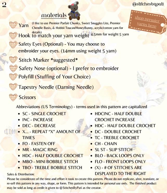 This pattern includes instructions to make a patchling bear. This is an advanced beginner pattern. Once the pattern is purchased, you will receive a pdf for both a digital version of the pattern and a printer friendly version. It is advised you download & save the pattern once you open the pattern to avoid loss of files.
