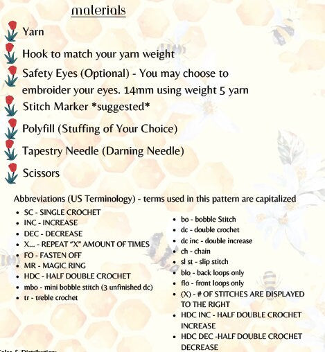 The pattern is written in English and uses US terms, written by a right-handed designer. A list of materials is included in the second photo of this listing.